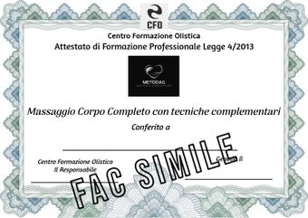 Al termine del Corso, viene rilasciato un Attestato di partecipazione e di Qualifica Professionale, utile al riconoscimento della propria formazione, in conformità a quanto previsto dalla attuale normativa in vigore (legge 4/2013)